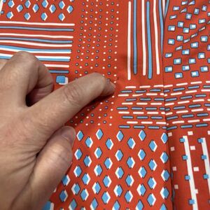 Design: Bold geometric patchwork print in bright orange, royal blue, and white.