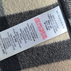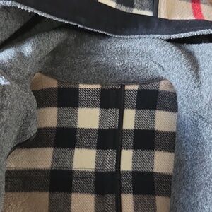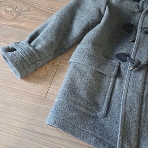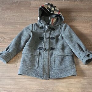 Warm gray kids' Burberry hooded jacket with classic toggle closures. Soft wool-blend fabric provides cozy insulation. Hood features contrasting nova check lining for a stylish touch. Two front flap pockets keep hands warm. Versatile coat ideal for everyday wear and cooler days. Classic and gently worn, size kids 7. 100% wool.