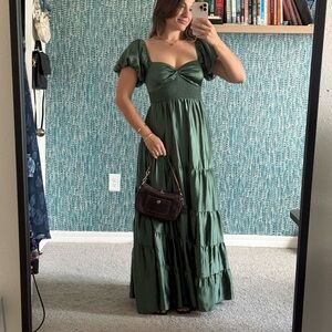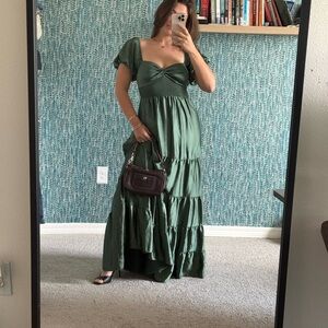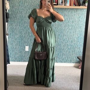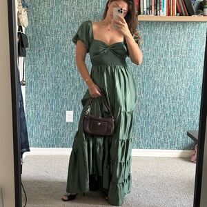 Free People Sundrenched Silky Maxi Dress Green Tiered Size small • ruched bust prairie maxi dress • tiered green goddess gown • romantic puff sleeve cottagecore dress • smocked empire waist maxi • renaissance milkmaid summer dress • vintage-inspired peasant gown • flowing ruffle hem evening dress • boho bridal rehearsal dinner dress • ethereal green fairytale dress • elegant regencycore evening gown • dreamy date night summer maxi • feminine garden party outfit • soft girl aesthetic fashion • modern Bridgerton inspired look • midsummer festival outfit idea • soft neutral resort wear dress • romantic vacation dinner outfit • floaty minimalist cottage fashion