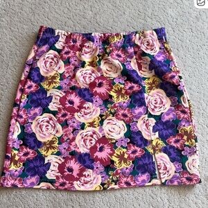 Five skirts in assorted prints and colors. Includes purple floral print, blue and white scroll print, tropical floral shorts, coral pink ruffle skirt, and light cream layered skirt. Elastic waists and casual styles. Great for mix-and-match summer outfits.