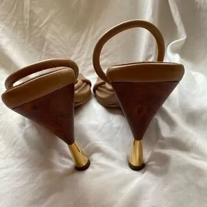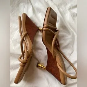 Gia Borghini Tan Strappy Square-Toe Heels with Gold Flared Heel