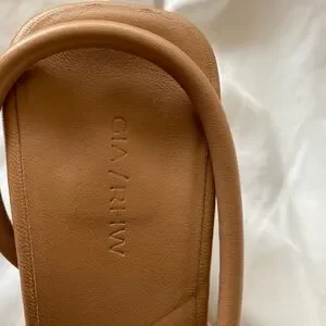 Sleek tan strappy sandals with crossed tubular straps. Square toe and padded footbed for added comfort. Distinct gold flared heel adds a refined touch.