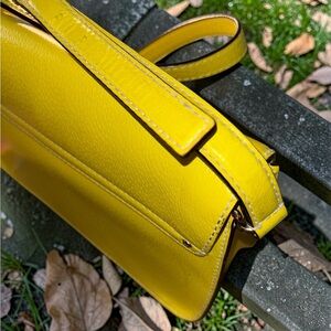 Kate Spade New York Wellesley flap crossbody in bright yellow pebbled leather with signature gold polka dot lining and logo plate. Structured classic Kate Spade style with adjustable crossbody strap. Perfect everyday bag.