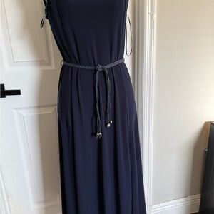 Sleeveless maxi dress with a braided tie belt. Smooth, draping fabric for an elongated silhouette. Simple neckline and flowing skirt. Classic navy color for versatile styling.