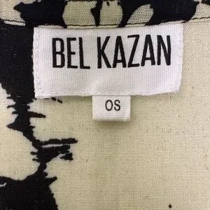 Flowy short kaftan from Bel Kazan. Features V-neckline and waist tie. The length is approximately 35 inches. It does have some areas on the neck that looks the colors may have bled.