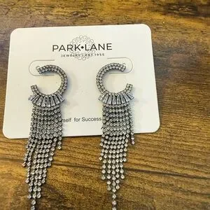 Park Lane statement earrings with sparkling silver crystals. Cascading fringe creates elegant movement. Eye-catching design for dressy occasions. Adds refined sparkle to evening looks.