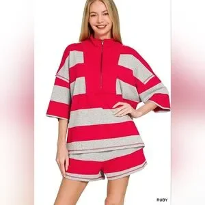 This Ruby Red Striped Lounge Set is perfect for relaxing at home or running errands in style. The set includes a comfortable top with a half zipper closure and short sleeves, paired with matching shorts. Made from a soft and breathable fabric, this set offers a relaxed fit and is easy to wear. The striped design adds a touch of casual charm, making it a versatile addition to your wardrobe. The material is a blend of cotton and polyester, ensuring both comfort and durability.
