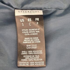 Liverpool Jeans Company women’s trench coat in mystic teal with a classic double-breasted silhouette and removable belt. Tailored yet lightweight, this piece features a structured collar that can wear up or down, functional pockets, button cuff details, and a back storm flap for classic trench styling. Made from 100% polyester shell and lining. Size Small. Excellent pre-owned condition. Ships fast from a smoke-free home.