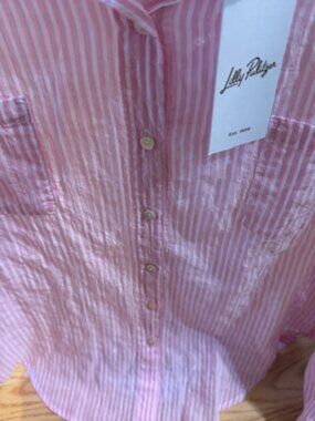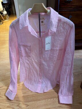 Add a versatile, preppy staple to your wardrobe with this lightweight button-down shirt from Lilly Pulitzer. Featuring the classic Oxford Stripe pattern in the beautiful Conch Shell Pink colorway, this shirt is BRAND NEW WITH TAGS (NWT) and in pristine, unworn condition.