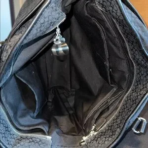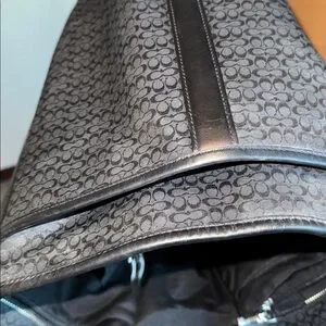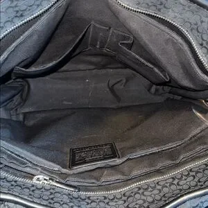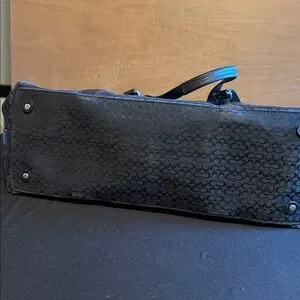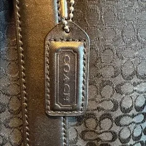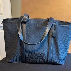Classic Coach tote with signature jacquard pattern. Leather trim and top handles. Zippered closure and hanging Coach tag. Spacious interior for daily use.