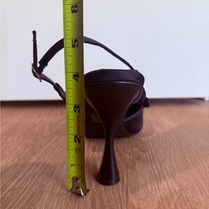 Elegant pointed-toe slingbacks featuring a prominent bow. Slim adjustable ankle strap for a secure fit. Curved kitten heel adds a refined touch. Smooth black finish for versatile styling.
