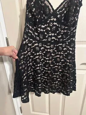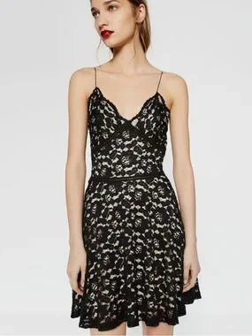 Zara A-Line Lace Spaghetti Strap Mini Dress w Nude Lining, Black, Sz L