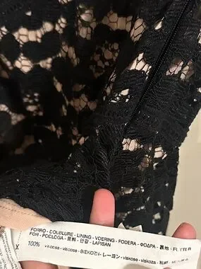In great pre-loved condition. Zara delicate black floral lace overlay. Soft nude lining beneath the lace. V-neck with thin spaghetti straps. Fitted bodice with a gently flared mini skirt. Chic and versatile for day or evening wear. The perfect dress for day or night.