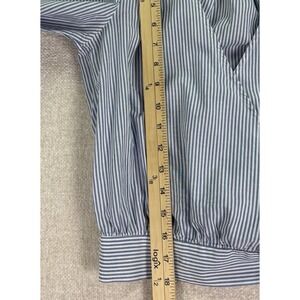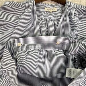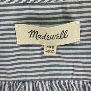 This Madewell Women's Top in size XXS features a wrap front tie design in blue and white stripes, with 3/4 sleeves and a V-neckline. Made from 100% cotton, this lightweight blouse is perfect for casual occasions during the summer or spring seasons. The woven fabric and regular fit make it comfortable for everyday wear. With a tie, buttons, and hook & eye closure, this top adds a stylish touch to your wardrobe with its summer fun theme. Made in Mauritius, this blouse is machine washable and a great addition to your collection.