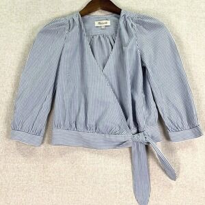 Madewell Women's Top Size XXS Wrap Front Tie Blue White 3/4 Sleeves 100% Cotton