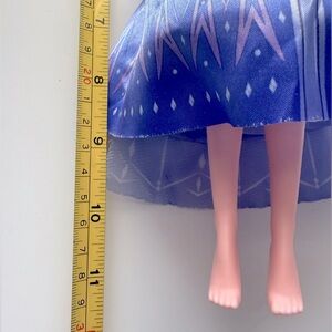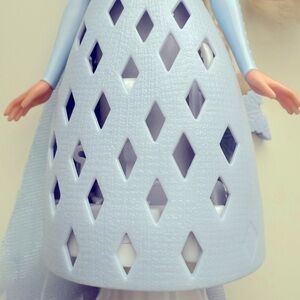 Elsa in a stunning fashion doll is dressed in a captivating ombré gown that transitions from light to royal blue, embodying a winter-inspired theme. Her long blonde hair is styled elegantly, complementing the intricate patterns on her full skirt. Perfect for imaginative play, this doll is a delightful addition to any collection.