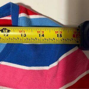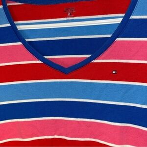 Gently used Tommy Hilfiger tee in great condition. Features red and blue stripes and a fitted silhouette. Short sleeves. Approximate measurements are shown in the photos.