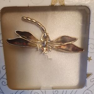 Gold tone dragonfly brooch. Wings feature brown enamel accents. Simple and elegant insect pin. Perfect for jackets, scarves, or bags.