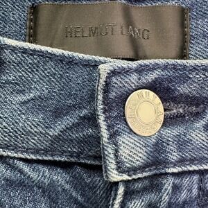 Keywords: Helmut Lang jeans, wide leg denim, zip detail, indigo wash, designer denim, fashion jeans, streetwear, contemporary fashion, unique design, statement pants, embellished jeans, casual chic, modern style, statement denim, statement jeans, asymmetrical, Y2K