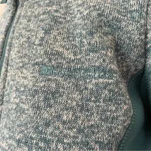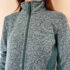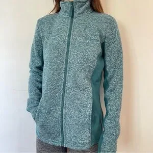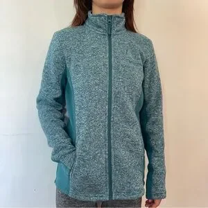 Teal full-zip utility jacket designed for versatile everyday wear. Soft heathered knit fabric offers comfortable warmth and easy layering. Zip-front closure and side pockets provide secure storage and a clean silhouette. Streamlined fit flatters while allowing freedom of movement.