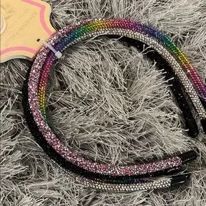 Set of sparkling rhinestone headbands in black, pink and rainbow hues. Comfortable, stylish headbands add instant glamour to any outfit. Durable construction with shimmering crystals for a bold, eye-catching look.