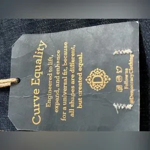 Dark wash denim wide leg jeans. Five-pocket styling Branded Democracy tag visible on garment.
