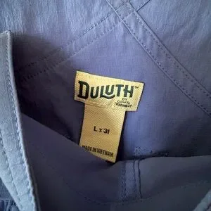 Durable work / garden overalls from Duluth Trading Co in a periwinkle blue. Features bib front with adjustable straps. Multiple utility pockets for tools and essentials. Relaxed fit for easy movement.