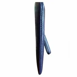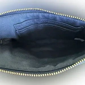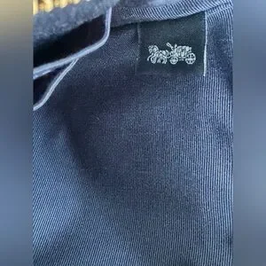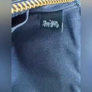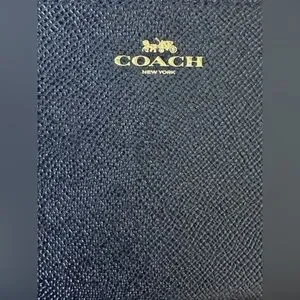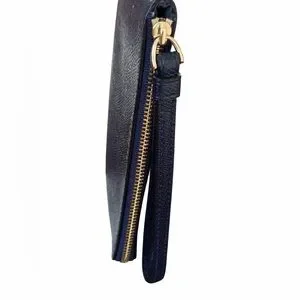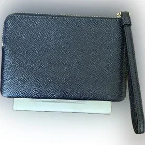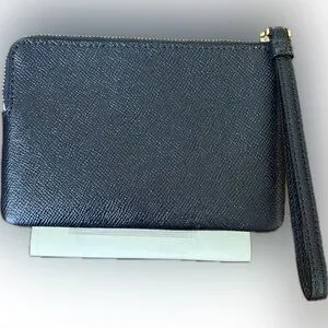 Sleek midnight blue Crossgrain leather wristlet by Coach. Gold logo and zipper accents. Ideal for cards and small essentials.