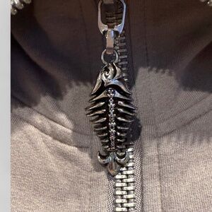 Front includes the signature metal seahorse skeleton zipper pull and ornate metal cord tips — true Faith Connexion detailing.