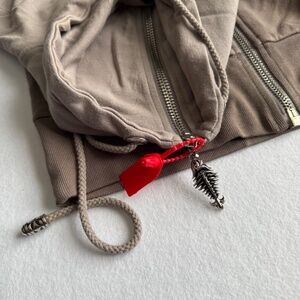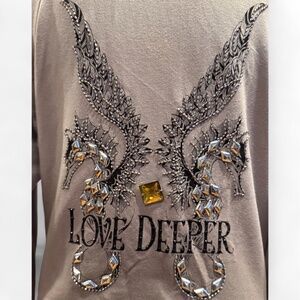 Rare and iconic Faith Connexion embellished zip-up jacket in gradient grey/tan. Features the brand’s signature gothic street-lux aesthetic with a 3D beaded seahorse + wing motif on the back, metallic studs, crystals, and the bold LOVE DEEPER graphic.
