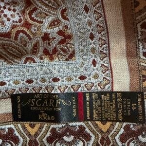 The "Art of the Scarf" by Tie Rack is a vintage, made-in-Italy line featuring bold, artistic patterns on polyester, size 45x46". Navy blue and beige patchwork, paisley, or geometric designs are common, often described as luxurious, silky soft, and versatile for styling