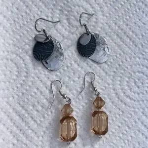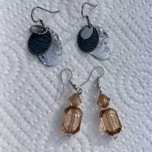 2 Pairs Drop Dangle Earrings Jewelry For Women Peach Colored & Blue/Green. The peach colored ones are 1 color. The silver & teal pair is silver on the large and small teardrop and teal on the medium teardrop.