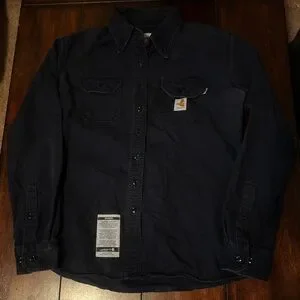 Classic Carhartt FR NFPA 2112 shirt in dark navy. Button-front design with dual chest pockets. Durable workwear fabric for everyday use. Subtle logo patch on chest. Versatile layering piece for work or casual wear.