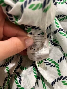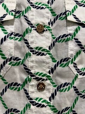 Crisp cotton Tory Burch button-down in a fresh white, green, and navy rope print—classic coastal energy with a tailored, feminine fit. Size 4, pit to pit approx. 20”. Excellent preowned condition with light natural wear. 100% cotton, lightweight and breathable, perfect styled open with denim or tucked into high-waisted pieces for a polished look. MSRP ~$198.