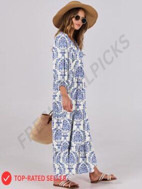 Boho Maxi Dress Flowy Swing V Neck Puff Sleeve Elegant Casual Summer