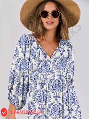 Style: Boho maxi dress with floral print, lantern puff sleeves, and flowy ruffle details