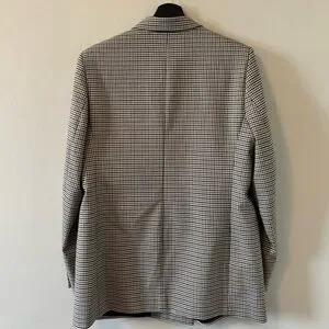 Double-breasted blazer with classic houndstooth pattern. Structured silhouette. Front pockets and buttoned cuffs. Size L. Gently worn