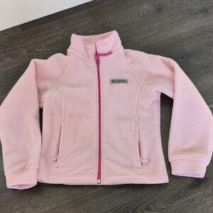 Light pink Columbia fleece jacket. Full front zipper in darker pink. Two zippered hand pockets. Stand collar for added warmth. Soft, cozy fleece fabric.