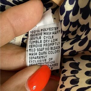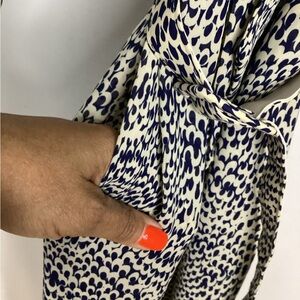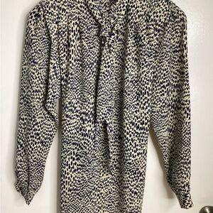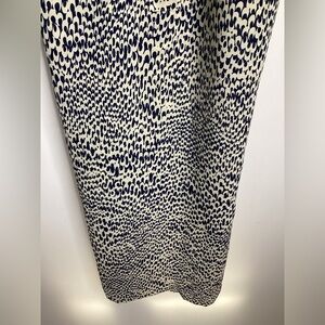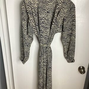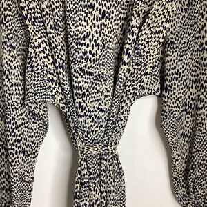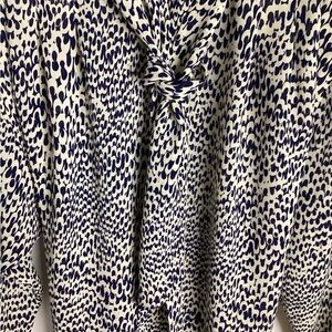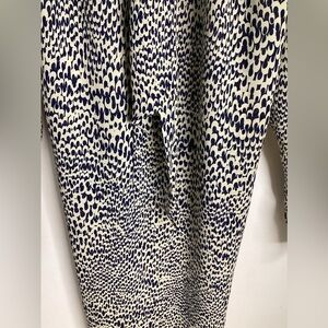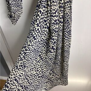 Classic tie-neck midi dress in a cream base with navy spotted print. Long sleeves and a relaxed silhouette for effortless wear. Versatile style that dresses up with heels or pairs easily with flats for everyday wear. PTP approximately 19-21 inches. Length approximately 42.5 inches. Two functioning pockets. Great condition.