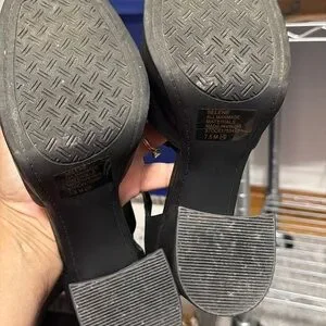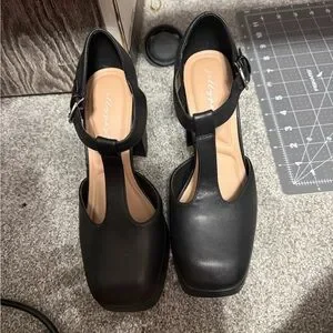 Black T-strap platform heels with a round toe. Thick block heel and cushioned insole for comfort. Adjustable ankle buckle for a secure fit. Sleek faux leather upper for a polished look.