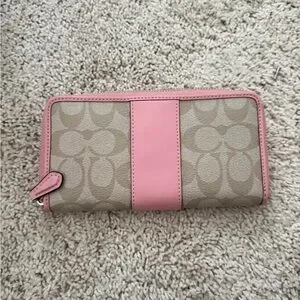 Coach zip-around wallet featuring beige signature monogram canvas with pink leather trim and center stripe. Sleek logo plaque on front. Functional and chic for daily use.
