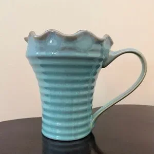 Hand crafted from stoneware with a ribbed body and a scalloped, ruffled top edge.