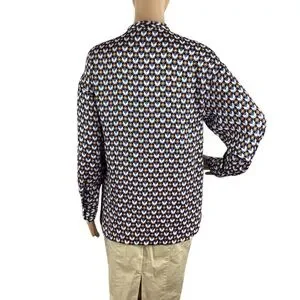 Tags: Zara geometric print blouse, retro geometric button down, abstract blue brown shirt, collared patterned blouse Zara, bold print casual top, vintage inspired geometric blouse, long sleeve work blouse, patterned button front shirt, 70s inspired print blouse, Zara abstract design top
