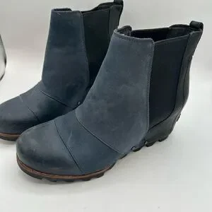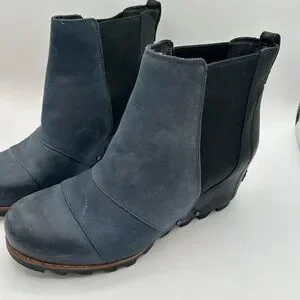 Sorel wedge ankle boots with Chelsea elastic side panels. Smooth navy leather upper with black heel and trim. Rugged outsole for traction. Easy pull-tab entry. Stylish and practical for everyday wear.