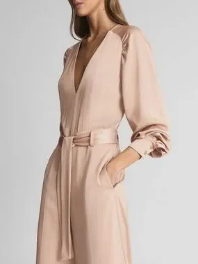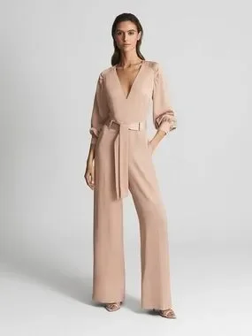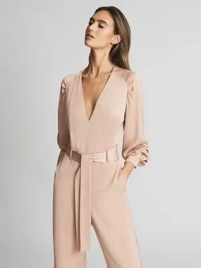 reiss jumpsuit, blush jumpsuit, nude jumpsuit, wide leg jumpsuit, belted jumpsuit, v neck jumpsuit, long sleeve jumpsuit, workwear outfit, business casual outfit, wedding guest outfit, minimalist style, neutral outfit, tailored jumpsuit, elegant jumpsuit, office outfit women, modern chic, capsule wardrobe, size 6 jumpsuit