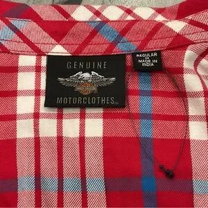 Lightweight plaid button-front shirt with chest pockets. Harley-Davidson shield patch on chest. Classic collar and relaxed silhouette. Easy layering piece for casual wear. Small snag on sleeve, not noticeable when worn.