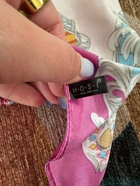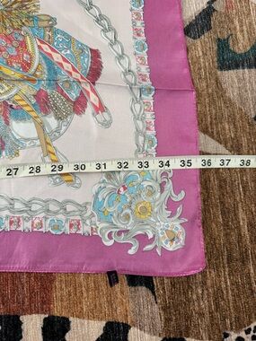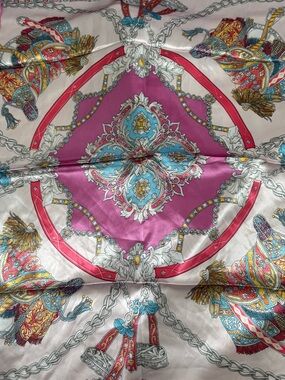 Elegant pink scarf with a colorful paisley and chain motif. Lightweight, silky fabric that adds a polished touch to outfits. Versatile styling for neck, head, or bag accents. Features vibrant pink with multicolor accents for a refined look.