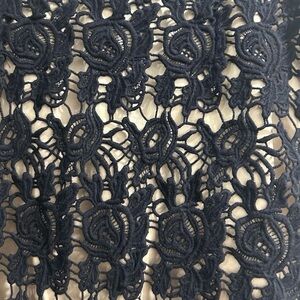 Beautiful and elegant skirt featuring a black floral lace overlay with a nude lining underneath that creates a stunning contrast. The intricate crochet-style lace design makes this piece perfect for formal events, parties, or an elegant night out.