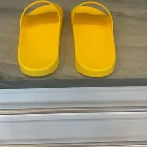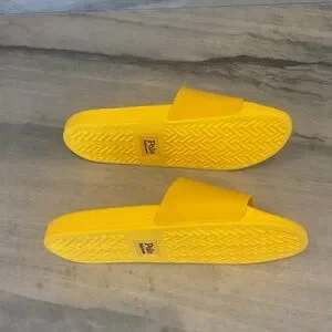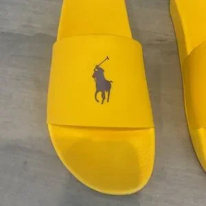 Slip-on men's slide in bold yellow. Soft contoured footbed for comfort. Synthetic upper with embroidered navy pony logo. Lightweight and easy to wear for casual outings. New never worn.