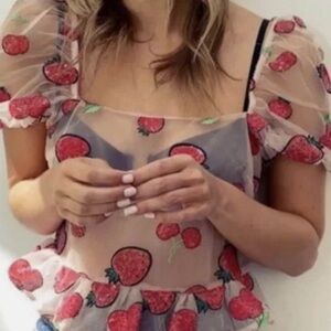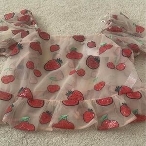 NWT Pink Strawberry & Cherry Sequin Peplum Puff Sleeve Sheer Top